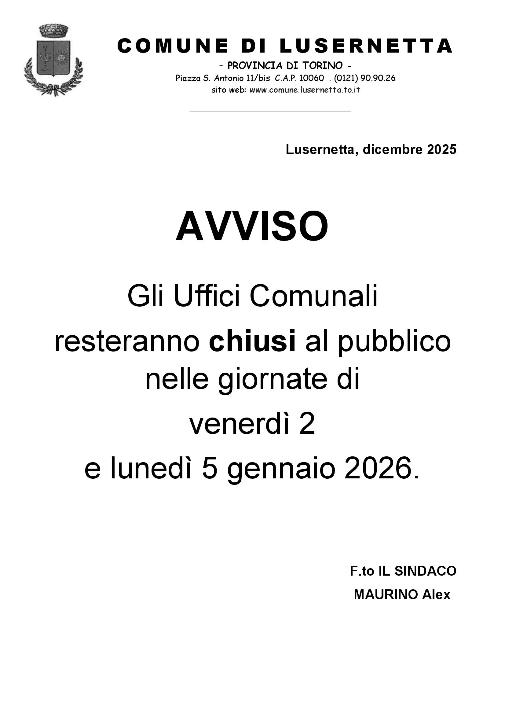 Descrizione Lusernetta, dicembre 2025 AVVISO Gli Uffici Comunali resteranno chiusi al pubblico nelle giornate di venerdì 2 e lunedì 5 gennaio 2026. F.to IL SINDACO MAURINO Alex