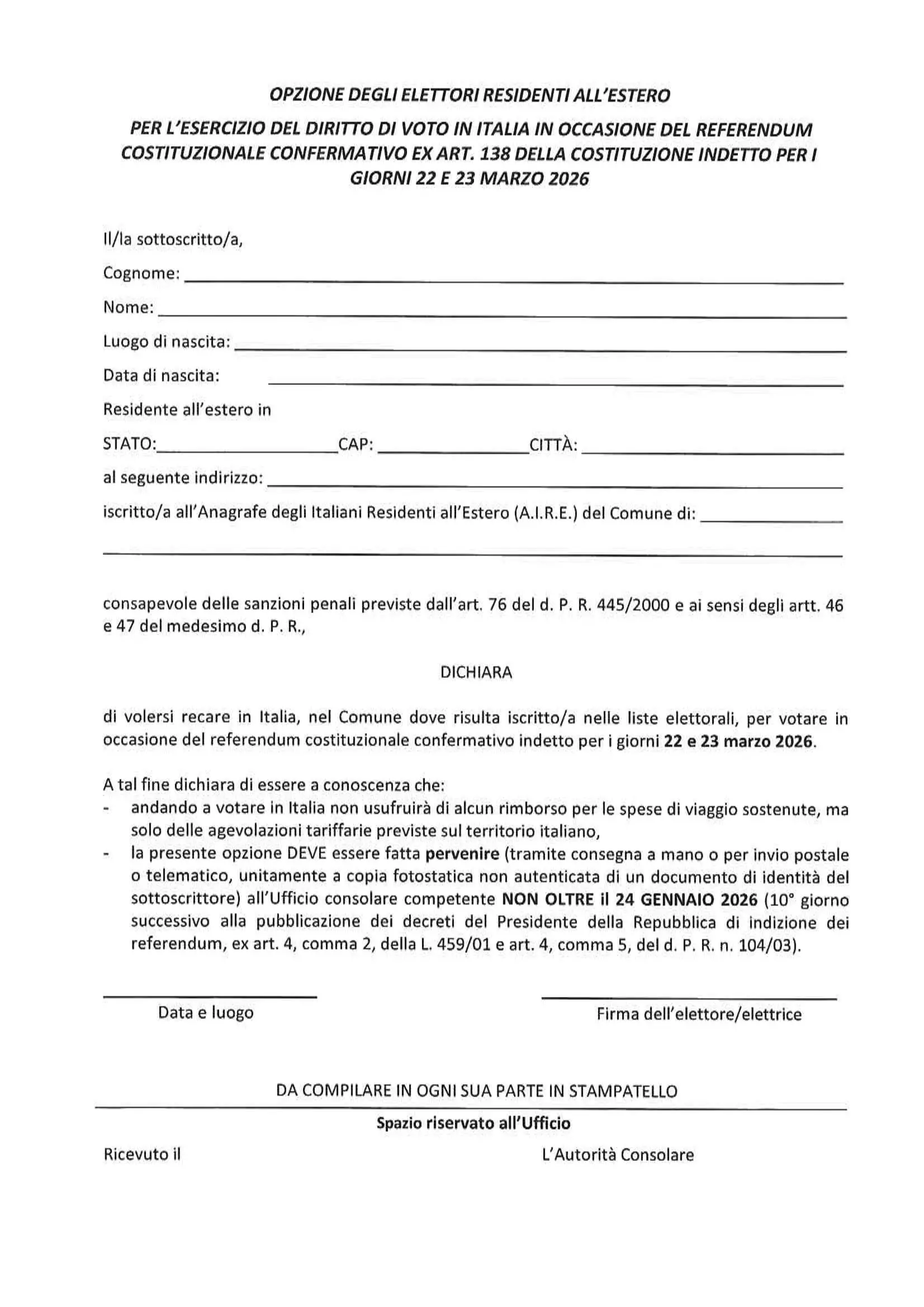 Descrizione Opzione degli elettori residenti all'estero per l'esercizio del diritto di voto in Italia in occasione del Referendum Costituzionale Confermativo ex art. 138 della Costituzione indetto per i giorni 22 e 23 marzo 2026.